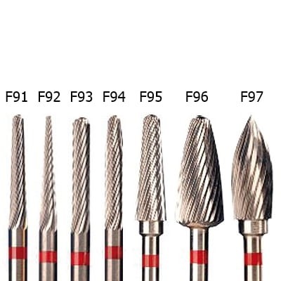 - Frezy do złota, metali i akrylowych tworzyw sztucznych (pasek czerwony, F91-F97)