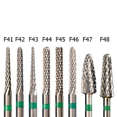- Frezy do szlifowania zgrubnego stali chrom-nikiel, chrom-kobalt i innych rodzajów stopów metali (pasek zielony, F41-F62)