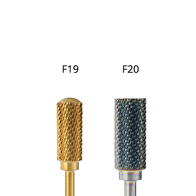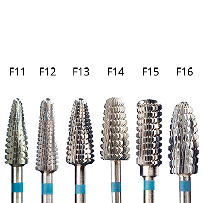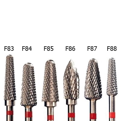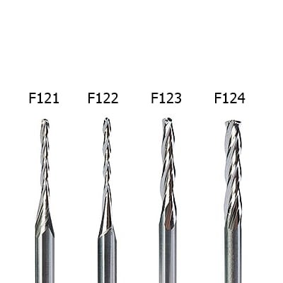 - Frezy do szlifowania stali chrom-nikiel, chrom-kobalt i innych rodzajów stopów metali oraz zgrubnego materiałów ceramicznych (pasek czerwony, F71-F88 oraz fioletowy, F101-F108)