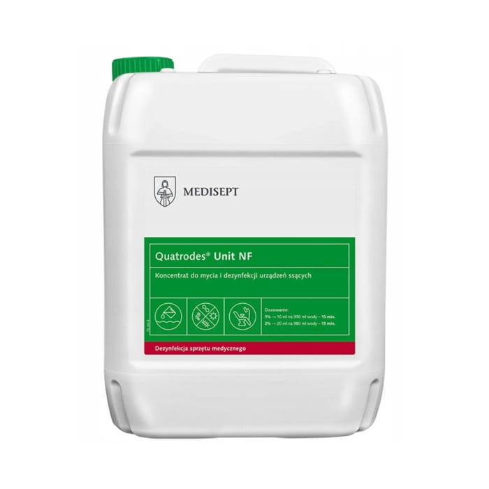 Quatrodes® Unit NF to koncentrat przeznaczony jest do jednoczesnego mycia i dezynfekcji systemów ssących, separatorów amalgamatu i misek unitu stomatologicznego. Preparat nie pieni się. Przy codziennym stosowaniu zapobiega powstawaniu biofilmu. Może być stosowany również do dezynfekcji obiegu zamkniętego w wannach z hydromasażem będących wyrobami medycznymi. Produkt przeznaczony do zastosowania przez profesjonalnego użytkownika.