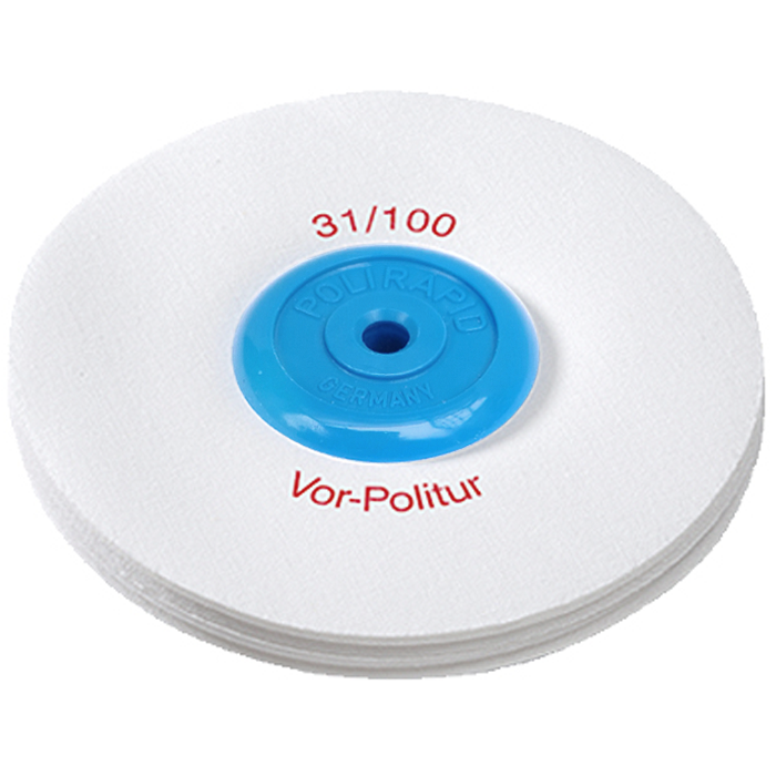 Wysokiej jakości impregnowany sztywny szmaciak niemieckiej firmy Polirapid, przeznaczony do polerowania wstępnego akrylu, metali, stopów szlachetnych, chromu, kobaltu, tytanu, stali nierdzewnej, aluminium i innych stopów nieszlachetnych.