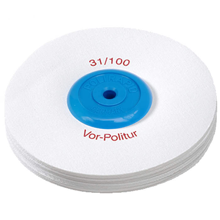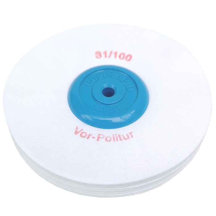 Wysokiej jakości impregnowany sztywny szmaciak niemieckiej firmy Polirapid, przeznaczony do polerowania wstępnego akrylu, metali, stopów szlachetnych, chromu, kobaltu, tytanu, stali nierdzewnej, aluminium i innych stopów nieszlachetnych.